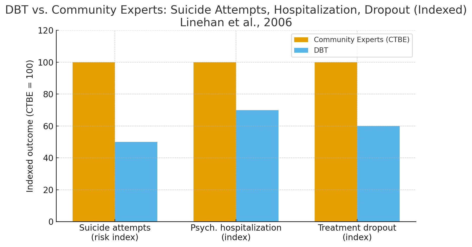 Figure 1 shows that DBT significantly reduced suicide attempts and psychiatric hospitalizations compared to treatment by community experts. After two years, DBT patients had 50% fewer suicide attempts and fewer psychiatric hospitalizations, while also maintaining higher treatment retention. Unlike many therapies where dropout is common, DBT’s structured approach kept participants engaged and safe over time.