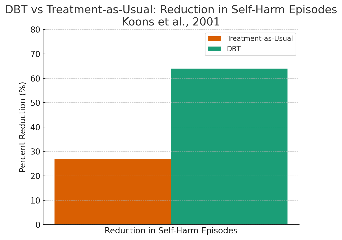 Figure 2 shows that DBT delivered greater reductions in self-harm, anger, and depression compared with treatment-as-usual in a Veterans Administration hospital trial. DBT participants experienced a 64% reduction in self-harm episodes, compared to only 27% in treatment-as-usual. In addition, DBT clients reported lower anger and depression scores and demonstrated higher treatment completion rates, showing DBT’s efficiency and durability across multiple domains of functioning.